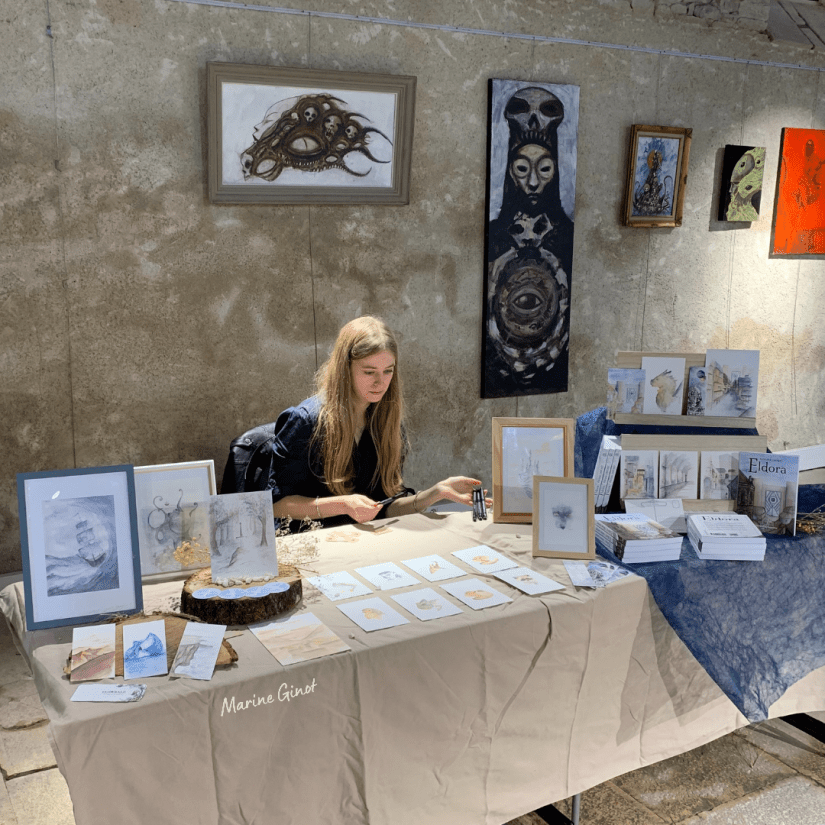 J’ai par ailleurs eu l’immense plaisir de participer à toutes les étapes de l’événement aux côtés de Floriane et je me suis régalée ! J’ai adoré réfléchir avec elle à l’installation de ses aquarelles et de son roman pour inciter les personnes à s’approcher de ses créations ! Merci beaucoup à toutes les personnes qui se sont arrêtées discuter livres, édition, fantasy, création et publication avec nous ! Une mention toute particulière pour Marie / Desdémone, Mélanie et la personne qui a eu du mal à rentrer chez elle samedi soir (désolée, j’ai oublié votre nom). (RDV sur mon site pour en savoir plus sur mon passage de l’autre côté du stand 😉 )